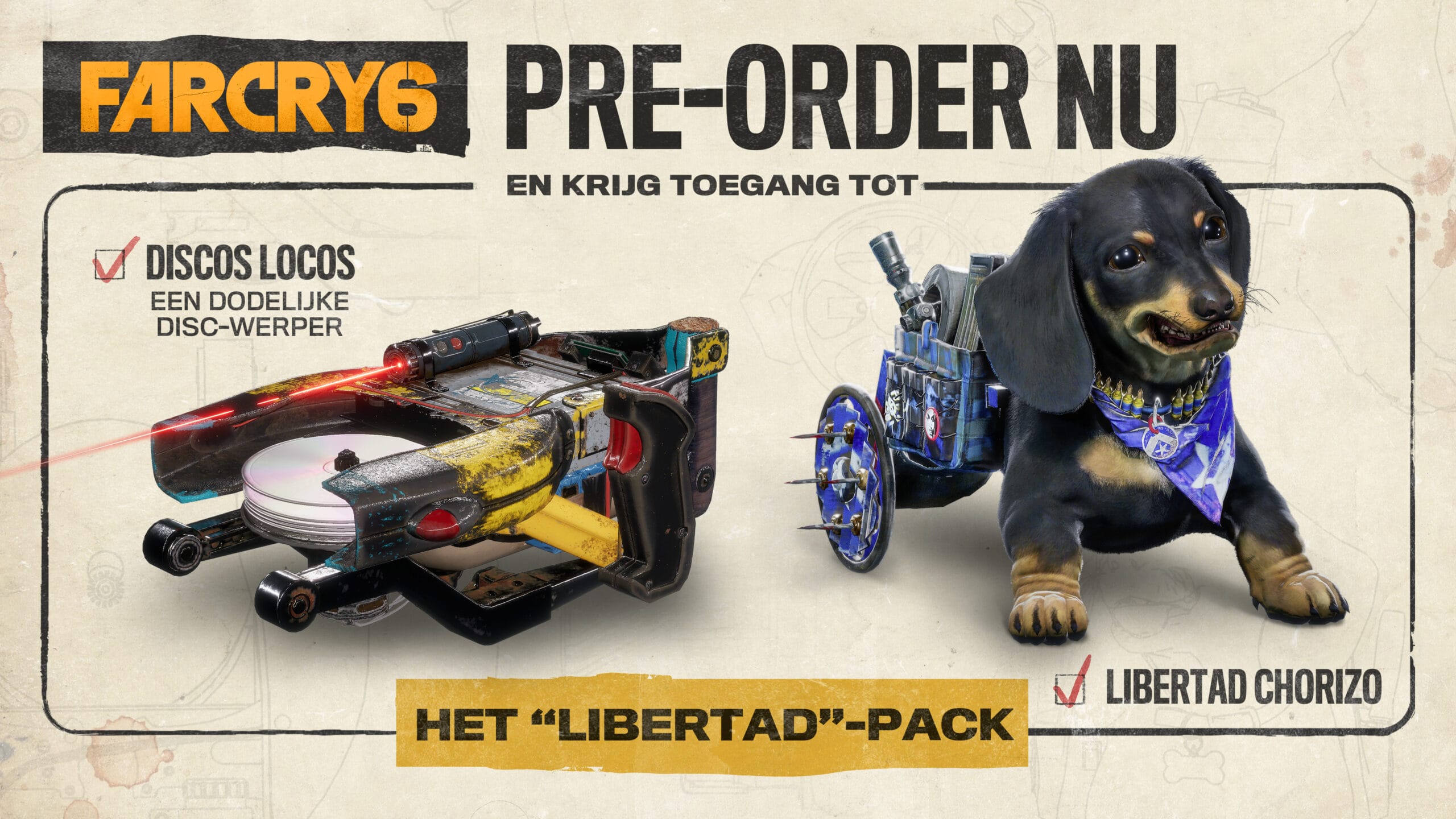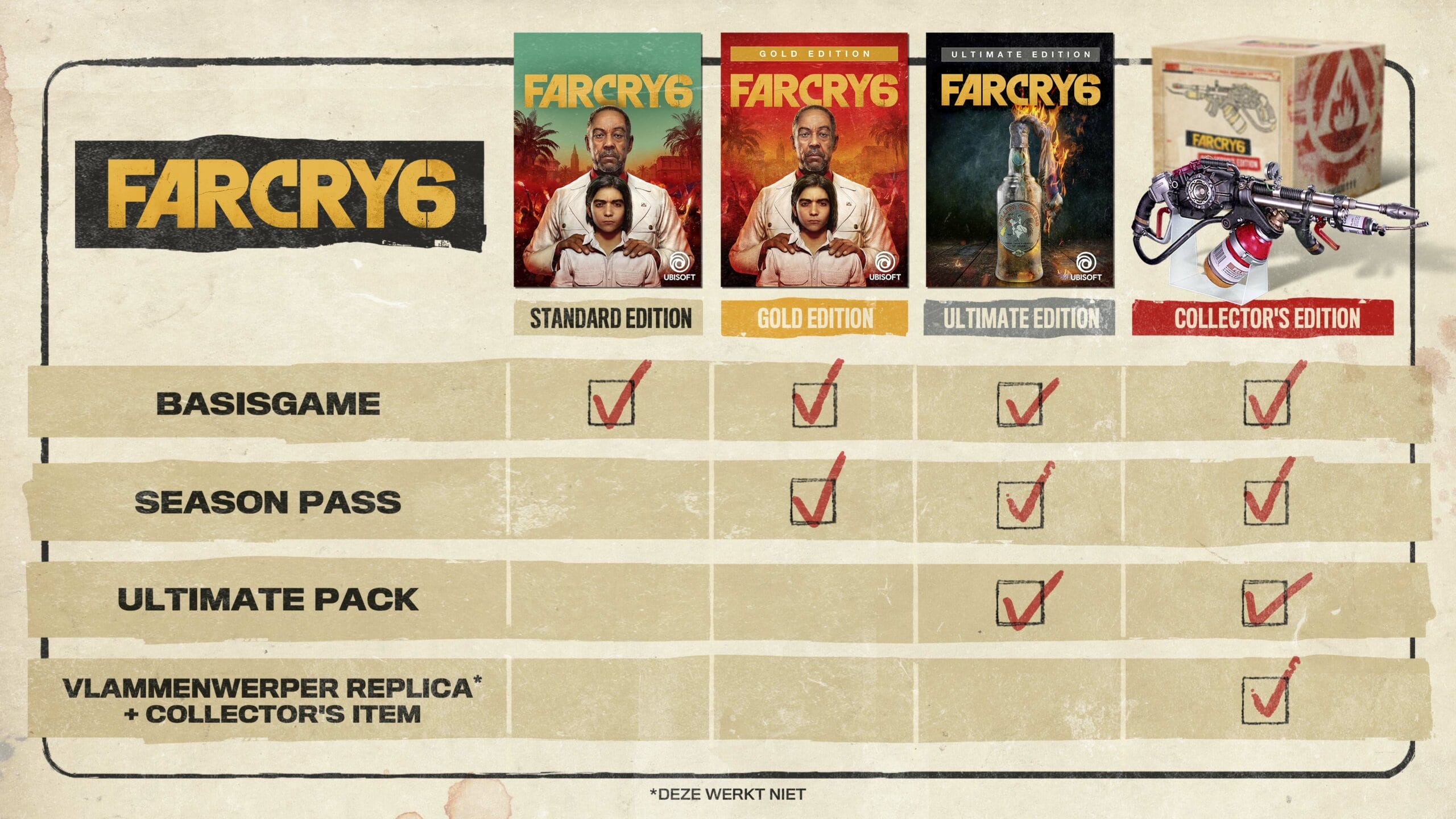 Far Cry 6 verschijnt op 18 februari 2021 voor de PlayStation 5, Xbox Series X, PlayStation 4, Xbox One, Google Stadia en de PC via the Epic Games Store en Uplay. Gamers die de PS4 of Xbox One-versie van Far Cry 6 aanschaffen kunnen gratis upgraden naar de PlayStation 5 of de Xbox Series X-versie.