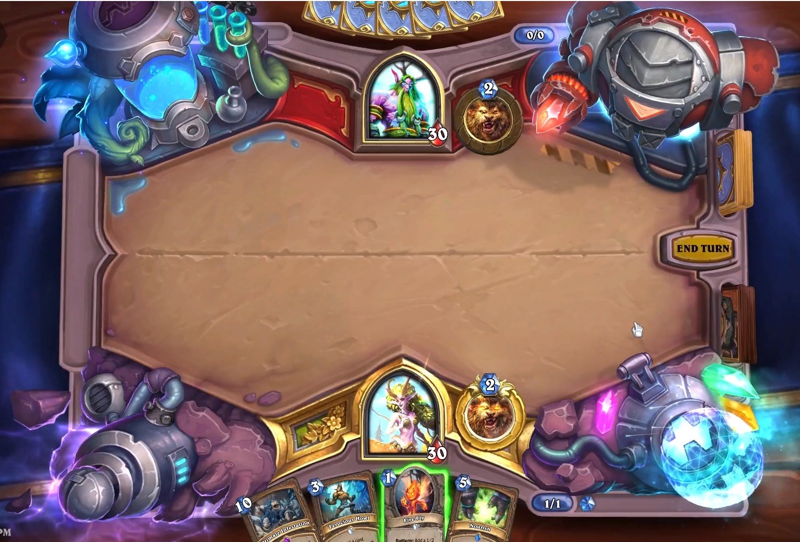 Zoals we al zeiden zullen mechs dus weer relevant zijn in The Boomsday Project. Zoals gebruikelijk, voegt ook deze uitbreiding een nieuwe keyword toe. Deze keyword draait dit keer om mechs en heet ’Magnetic’. Minions met Magnetic kunnen zich als het ware fuseren met mech minions. Als je een minion met Magnetic, links van een mech speelt, dan worden ze samengevoegd tot één minion. Hierbij worden de stats en kaarteffecten overgenomen door het gefuseerde minion. Hiermee kan je zeer interessante combo’s uitvoeren. Denk bijvoorbeeld aan een zwakke minion met een goede kaarteffect, die je kan fuseren met een minion met goede stats, zodat je één hele sterke minion krijgt. Een combo die wij erg tof vonden was bijvoorbeeld Venomizer met Missile Launcher. Missile Mauncher is een minion met Magnetic dat 1 damage doet aan alle vijandelijke minions aan het einde van je beurt. Venomizer is een kaart die beschikt over Poisonous. Minions met Poisonous doden een minion als ze schade verrichten, als je deze minions dus samenvoegt dan kan je alle vijandelijke minions in één beurt doden. Er zijn talloze combos zoals deze die je kunt uitvoeren.