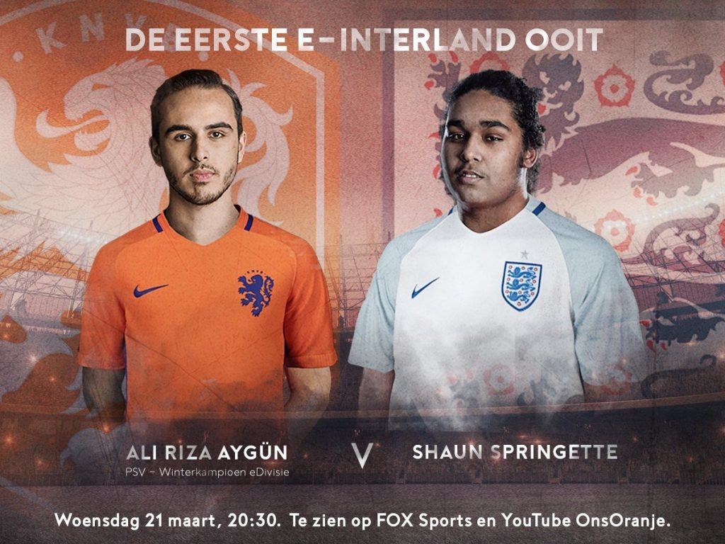 Nederland en Engeland spelen woensdagavond de eerste officiele e-interland ooit. De wedstrijd begint om 20:30 en hier neemt Ali Riza het voor Nederland op tegen Shaun Springette uit Engeland. De wedstrijd wordt in samenwerking met de KNVB en de FA georganiseerd.