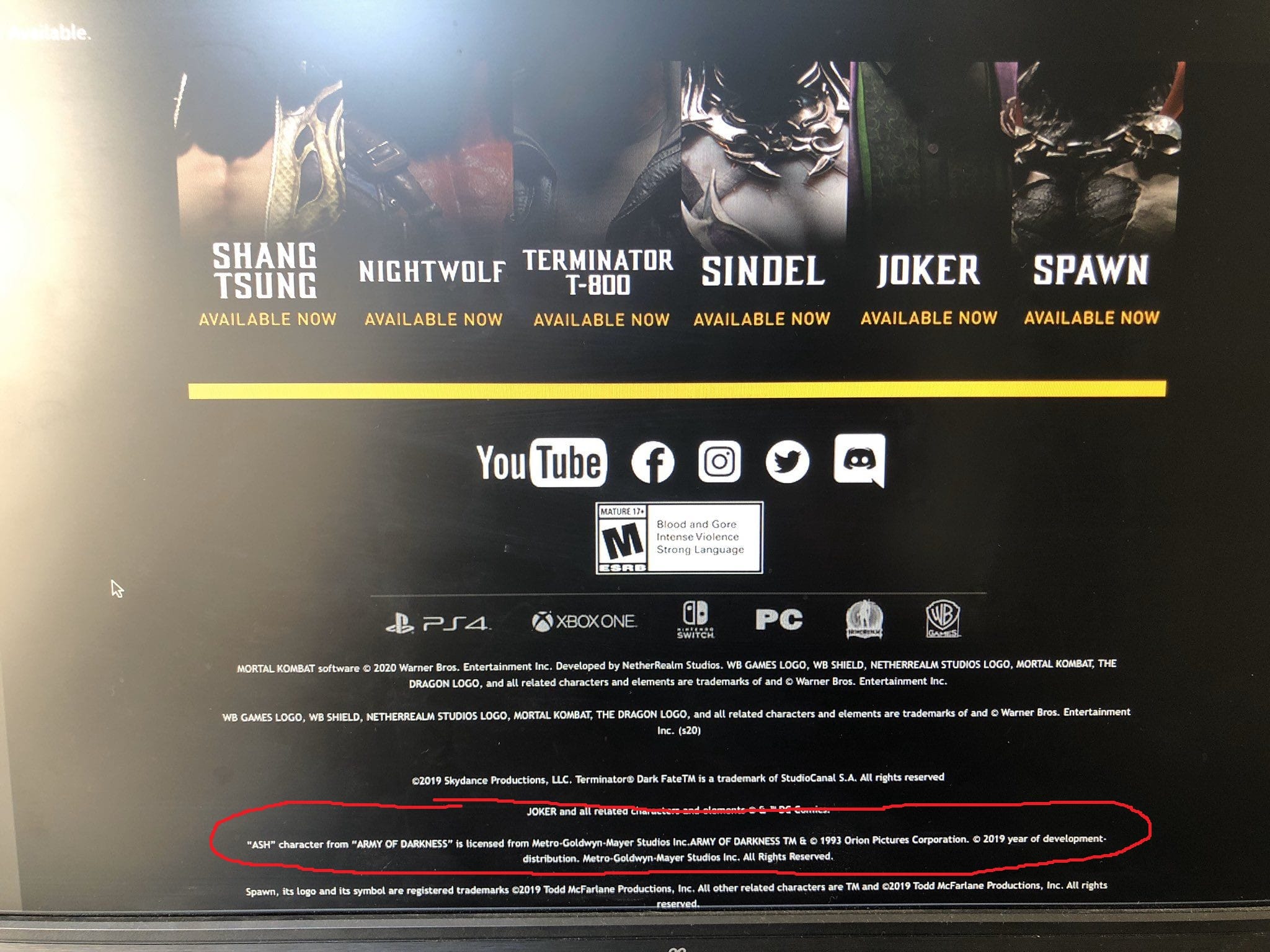 Laatstgenoemde lijkt nu te komen want deze is zo goed als zeker gelekt door ontwikkelaar NetherRealm zelf. In een nieuwsbrief die recent werd gestuurd zijn alle huidige zes DLC-personages te zien. Alles lijkt normaal, maar de tekst daaronder is zeer opvallend. Daar staan namelijk copywrites voor Ash Williams en Army of Darkness. Dat is vreemd want Ash Williams is nooit genoemd door uitgever Warner Bros of ontwikkelaar NetherRealm. Dat Ash nu opeens staat in de tekst in een Mortal Kombat-nieuwsbrief, maakt het zeer aannemelijk dat Ash binnenkort speelbaar wordt.