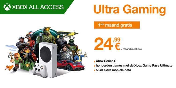 Het Xbox All Access Ultra Gaming-pakket van Orange en Microsoft is beschikbaar tot 2 januari 2023 voor nieuwe én bestaande Love-abonnees. Het pakket kost €24,99 per maand en is alleen beschikbaar via Orange in België. Deze actie is niet beschikbaar in Nederland.