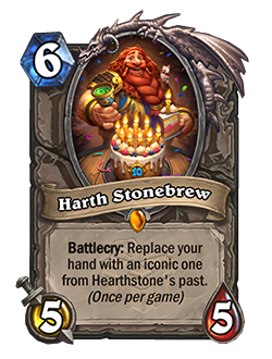 De tweede gratis legendarische kaart is Harth Stonebrew zelf, de mascotte van Hearthstone wordt na 10 jaar eindelijk speelbaar. Deze kaart wordt gratis weggegeven om het 10 jaar bestaan van Hearthstone te vieren. Wanneer je Harth Stonebrew inzet, krijg je een random hand uit het verleden.