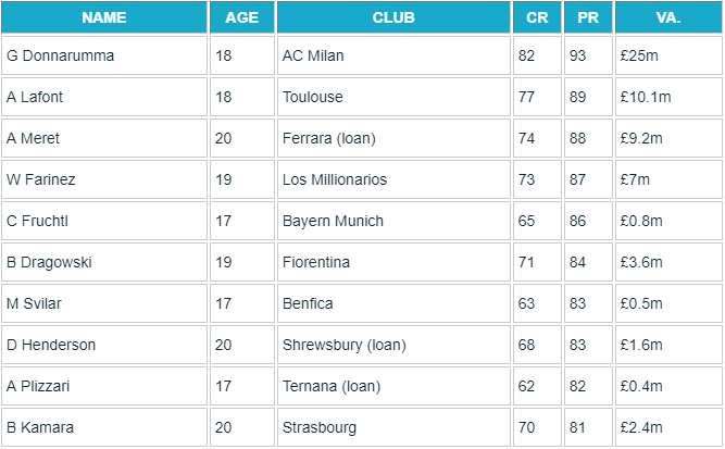 Ook deze goalie is slechts 18 jaar oud, maar heeft al bijna 100 wedstrijden achter zijn naam staan voor Toulouse. In het begin van de carrière is hij 77 en kost rond de 10 miljoen euro. Uiteindelijk zal hij gaan doorgroeien tot een (ongetrainde) rating van 89. - Alex Meret