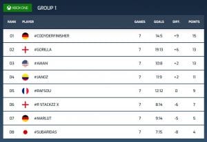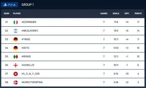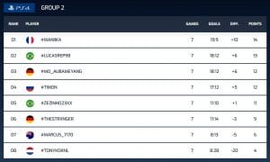 Dani Hagebeuk heeft zich net aan geplaatst voor de kwartfinales. Ondanks dat de eSporter van Ajax flink wat pech heeft gehad met late gelijkmakers of verliespartijen, wist hij zich toch te plaatsen voor de kwartfinales op doelsaldo! Dani had 9 punten behaald met een doelsaldo van +2 en werd 4e. De Qatarees #AMEGHESSIB behaalde 9 punten en een doelsaldo van 0 en werd net 5e. Wat als een verrassing gezien kan worden is dat de Engelsman #TASS laatste is geworden in deze groep. Hij werd gezien als een grote kanshebber voor de titel, maar kon dit niet waarmaken. De overige geplaatsten zijn: De Fransman #ROCKYY, de Canadees #FILTHYP94 en de Amerikaan #JOEY.