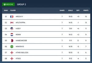 Er waren vier poules van acht deelnemers. Twee groepen Playstation en twee groepen Xbox. Iedereen speelde één keer tegen elkaar en dus waren er 7 wedstrijden. De top 4 van de poules gaat door naar de kwartfinales, die plaatsvinden vandaag vanaf 13:00!