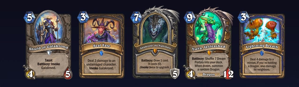 Zoals de titel het ook aangeeft, draaien de nieuwe kaarten vooral om draken. De uitbreiding zal op 10 december 2019 verschijnen en daarmee wordt ook The Year of the Dragon-trilogie afgesloten. Een paar nieuwe kaarten zijn alvast hieronder te zien waaronder de nieuwe hero-kaart Galakrond, the father of all dragonkind. Door minions met de keyword ‘invoke’ te spelen kunnen spelers, Galakrond tot drie keer transformeren.