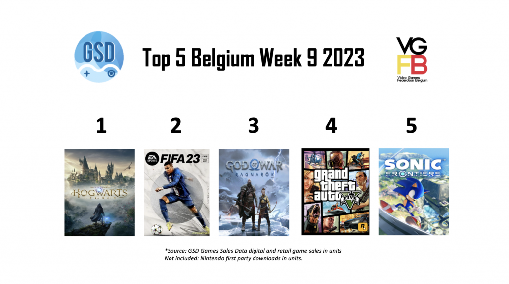 In week 9 van 2023 staat nieuwkomer Hogwarts Legacy, de open wereld Harry Potter spin-off game op de eerste plek. Op nummer 2 staat FIFA 23, een game die vrijwel iedere week in de top 5 staat. FIFA 23 wordt gevolgd door de PlayStation-exclusieve God of War: Ragnarok. Vervolgens zien we GTA V staat op de vierde plek, een game die bijna 10 jaar oud wordt. Als laatste op de vijfde plek zien we deze week de open wereld game Sonic Frontiers.