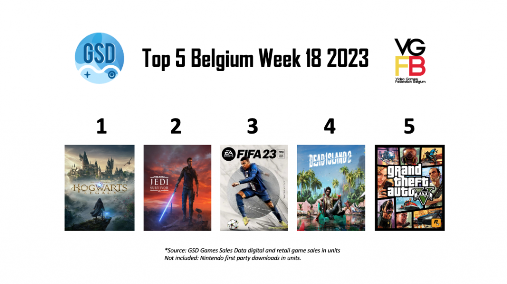Op nummer 2 staat de Soulslike action game Star Wars Jedi: Survivor. Op plek 3 staat FIFA 23, een game die het jaar door goed verkoopt. FIFA 23 wordt gevolgd door de semi open wereld zombiegame Dead Island 2 en GTA V.