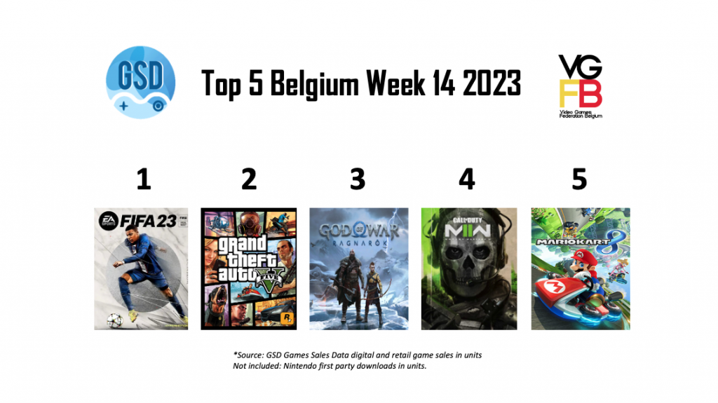 In week 14 van 2023 staat enkele nieuwkomers. Op nummer 1 staat FIFA 23, een game die altijd wel goed verkoopt en in de top 5 staat. Op nummer 2 staat GTA V, een game die bijna 10 jaar oud wordt maar nog steeds verkoopt als warme broodjes. Op 3 staat de PlayStation-exclusieve God of War: Ragnarok, gevolgd door de shooter Call of Duty: Modern Warfare 2 en als laatste Mario Kart 8: Deluxe.