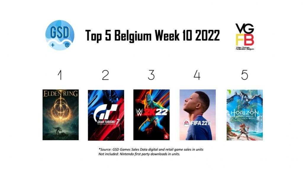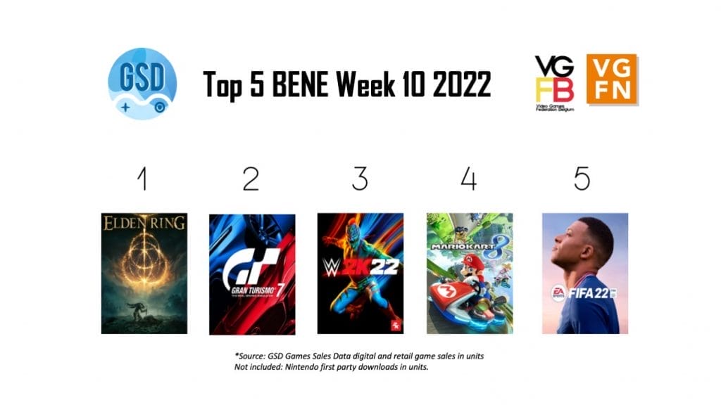 In week 10 van 2022 bestaat de top 5 van de Benelux voornamelijk om nieuwe releases. De best verkopende game van afgelopen week is Elden Ring. Sinds de release staat Elden Ring op nummer 1 best verkopende game in de Benelux. Elden Ring wordt gevolgd door Gran Turismo 7 en de nieuwe Amerikaanse worstelgame WWE 2K22. Op nummer 4 en 5 staan wat oudere releases namelijk Mario Kart 8: Deluxe en FIFA 22.