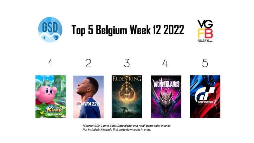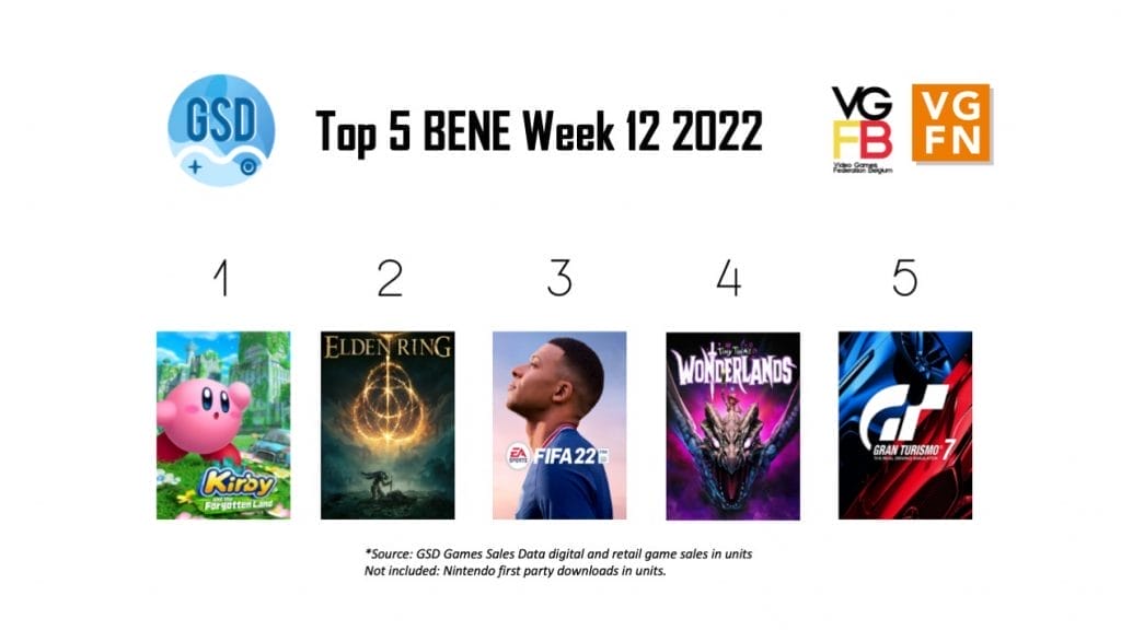 In week 12 van 2022 bestaat de top 5 van de Benelux voornamelijk om nieuwe releases. De best verkopende game van afgelopen week is niet Elden Ring, maar nieuwkomer Kirby en de Vergeten Wereld. Elden Ring moet genoegen nemen met de tweede plaats. Op nummer 3 staat FIFA 22, een game die altijd goed verkoopt in de Benelux.