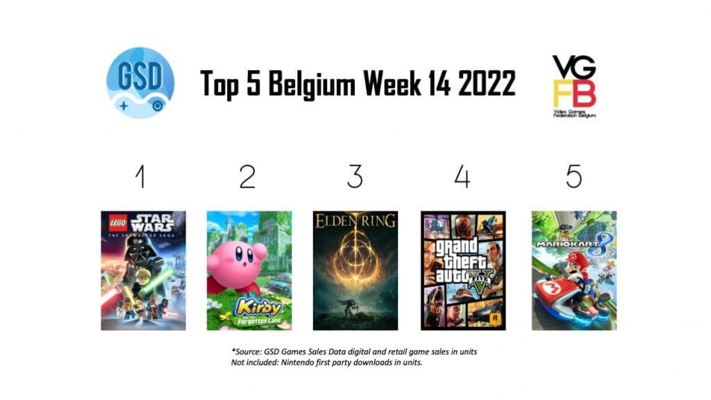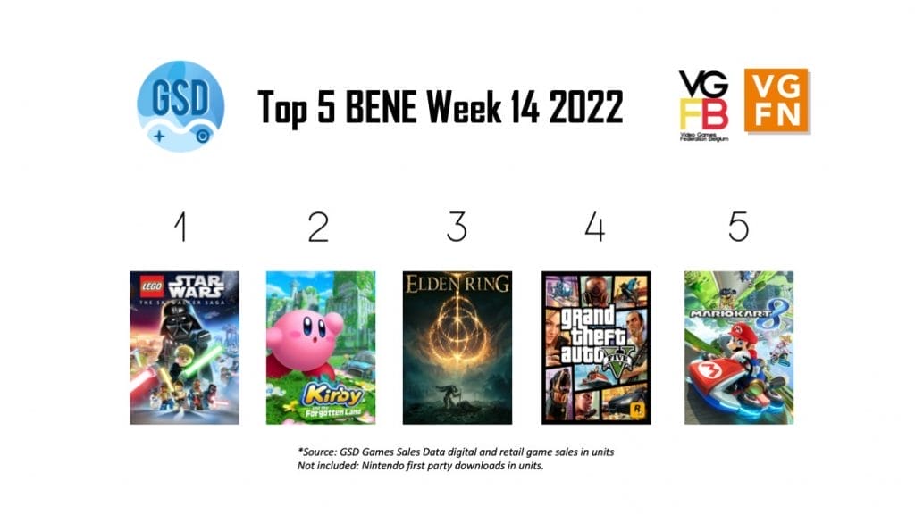In week 14 van 2022 bestaat de top 5 van de Benelux voornamelijk om games die dit jaar zijn verschenen met op nummer 1 de grote release van april namelijk LEGO Star Wars: The Skywalker Saga. Kirby doet het ook uitstekend en blijft op de tweede plek, gevolgd door Elden Ring die nog altijd als warme broodjes lijkt te verkopen. Op nummer staat GTA V, de best verkopende premium game ooit en als laatste op de 5e plek staat Mario Kart 8: Deluxe.