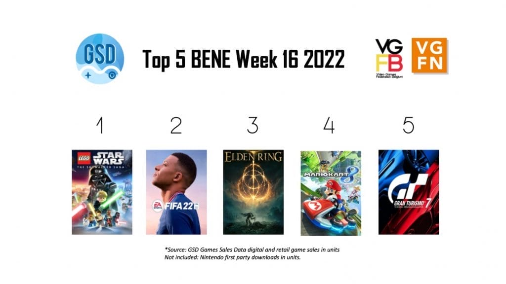 In week 16 van 2022 staat wederom LEGO Star Wars: The Skywalker Saga op nummer 1. Eerder deze week werd al bekend dat deze game de beste lancering ooit achter de rug heeft gehad van een LEGO-game. Op nummer 2 staat FIFA 22, gevolgd door Elden Ring, Mario Kart 8: Deluxe en Gran Turismo 7.