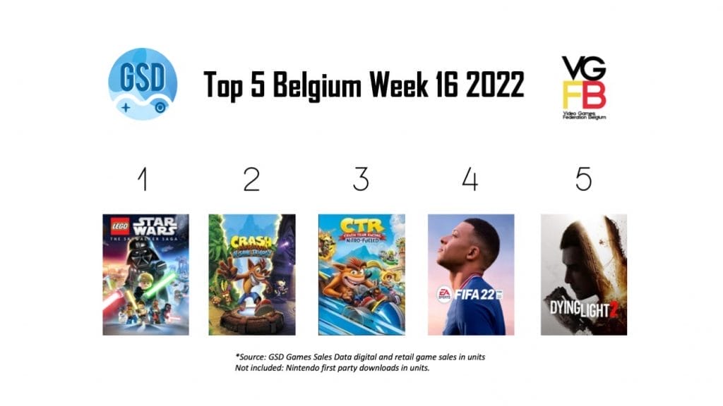 De top 5 van alleen België is deze week wederom opvallend te noemen. Ook hier staat LEGO Star Wars: The Skywalker sage op de eerste plek, maar op nummer 2 en 3 staan opmerkelijk genoeg oude Crash Bandicoot-games. Ten slotte is FIFA 22, de vierde beste verkopende game deze week in België en op 5 staat de open wereld zombiegame Dying Light 2.