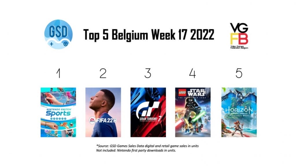 De top 5 van alleen België is ietsje anders. Ook hier staan Nintendo Switch Sports en FIFA 22 op de eerste twee plekken. Op nummer 3 staat de racegame Gran Turismo 7, gevolgd door LEGO Star Wars: The Skywalker Saga en Horizon II: Forbidden West.