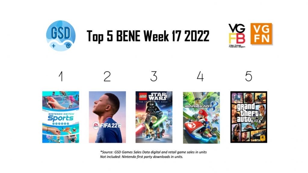 In week 17 van 2022 staat nieuwkomer Nintendo Switch Sports op de eerste plek. FIFA blijft het goed doen en staat op de tweede plek, ondanks dat de game deze maand ook gratis beschikbaar is via PS Plus. Om nummer 3 staat LEGO Star Wars: The Skywalker Saga, gevolgd door Mario Kart 8: Deluxe en GTA V.