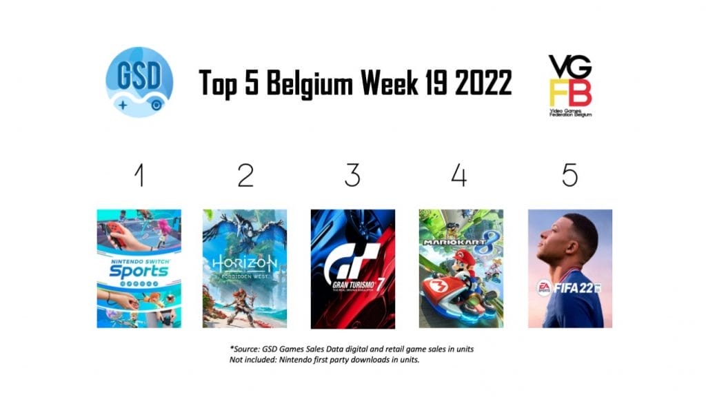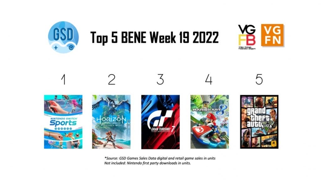 In week 19 van 2022 staat nieuwkomer Nintendo Switch Sports op de eerste plek. Horizon II: Forbidden West maakt een grote comeback en staat niet alleen weer in de top 5 maar staat ook gelijk op de tweede plek. Op nummer 3 staat er wederom een Sony-game namelijk Gran Turismo 7. Op nummer 4 staat verder Mario Kart 8: Deluxe en GTA V.