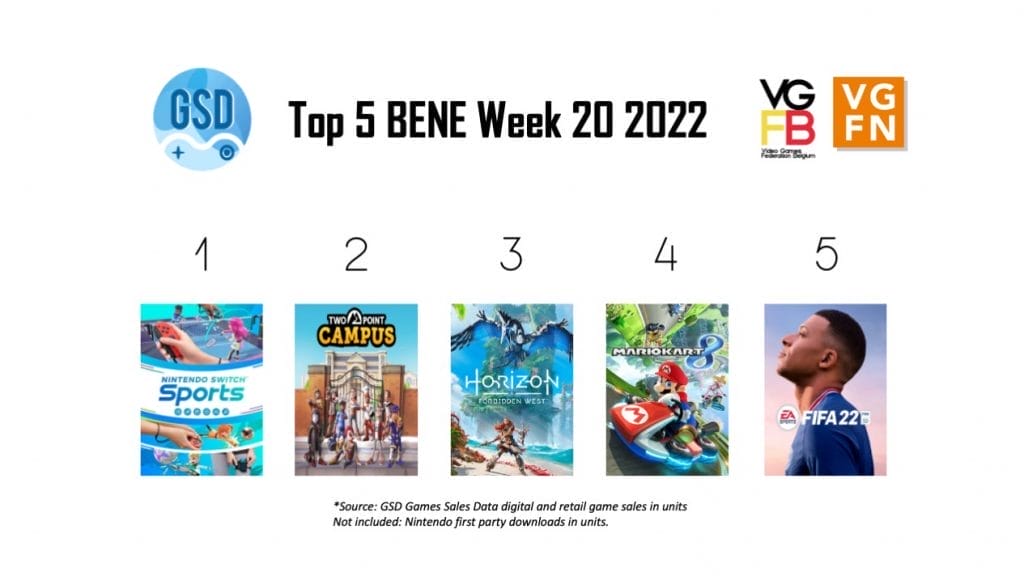 In week 20 van 2022 staat wederom de unieke motion control game Nintendo Switch Sports op de eerste plek. Op nummer 2 staat opvallend genoeg de nieuwe game Two Point Campus, waar spelers een eigen universiteit kunnen runnen. Op nummer 3 staat Horizon II: Forbidden West, gevolgd door Mario Kart 8: Deluxe en FIFA 22.