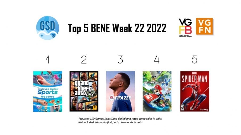 In week 22 van 2022 staat wederom de unieke motion control game Nintendo Switch Sports op de eerste plek. Op nummer 2 staat een game die bijna altijd in de top 5 terecht komt namelijk GTA V. Op nummer 3 staat FIFA 22, gevolgd Mario Kart 8: Deluxe en Marvel’s Spider-Man.