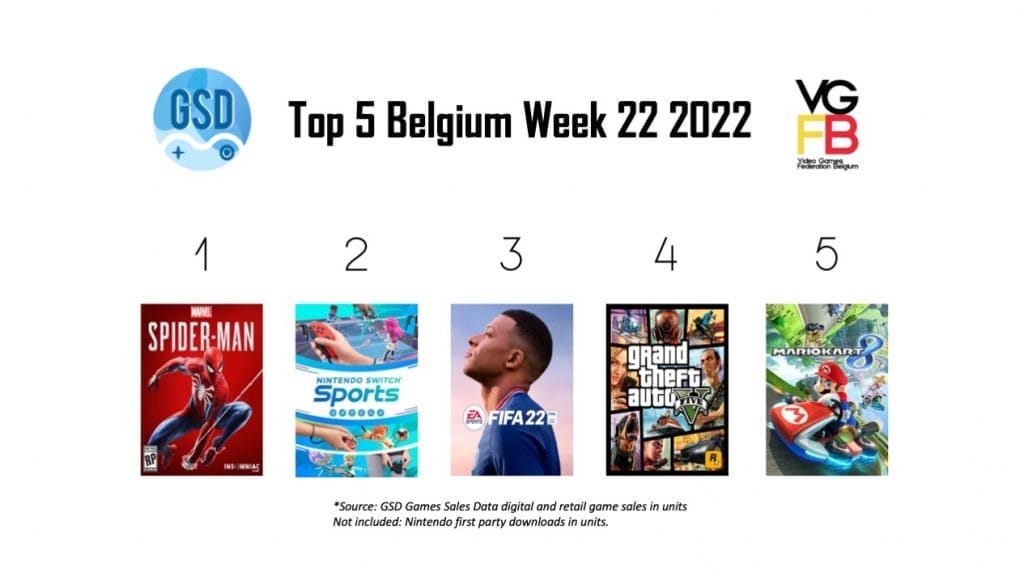 De top 5 van alleen België is ietsje anders. Hier staat Marvel’s Spider-Man niet op de 5e plek, maar op de eerste. Nintendo Switch Sports moet hier genoegen nemen met de tweede plaats. FIFA 22 staat hier op positie 3, gevolgd door GTA V en Mario Kart 8: Deluxe.