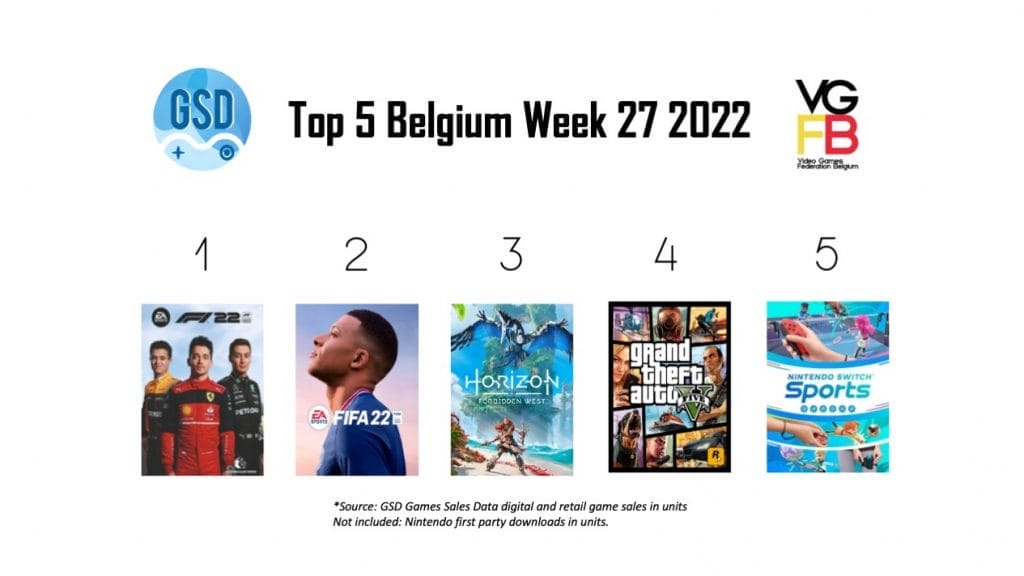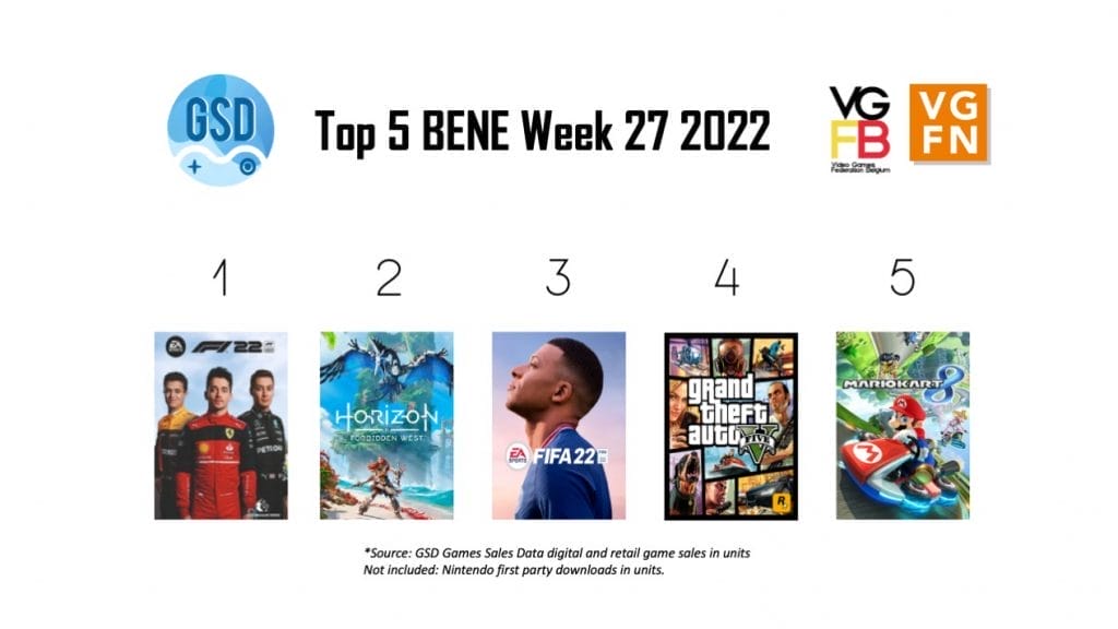 In week 27 van 2022 staat nieuwkomer F1 22 op de eerste plek. Op nummer 2 staat de PlayStation-exclusieve Horizon II: Forbidden West, gevolgd door FIFA 22, GTA V en Mario Kart 8: Deluxe.