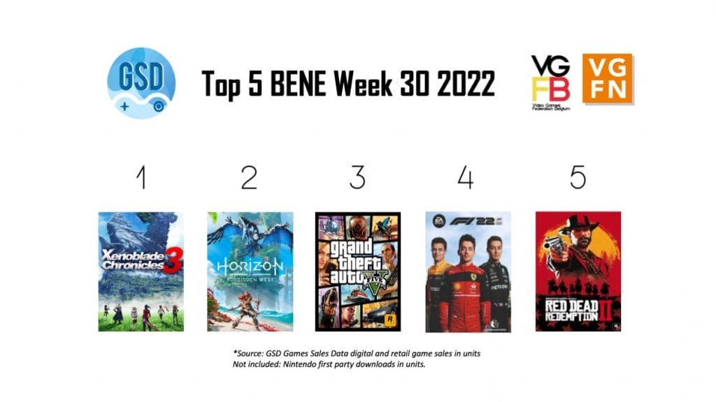 In week 30 van 2022 staat nieuwkomer Xenoblade Chronicles 3 op de eerste plek, een JRPG waar je makkelijk 150 uur in kan steken. Op nummer 2 staat nog een exclusieve game maar dan voor PlayStation namelijk Horizon II: Forbidden West. Op nummer 3 staat een game die het al 9 jaar goed doet namelijk GTA V. Op nummers 4 en 5 staan respectievelijk F1 22 en Red Dead Redemption 2.