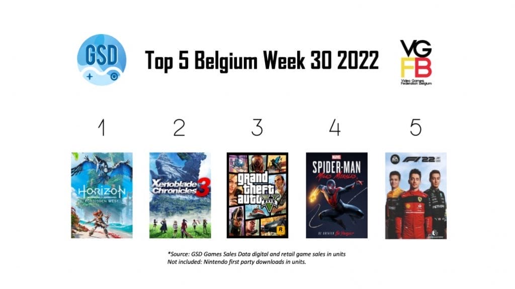 De top 5 van alleen België is ietsje anders. Hier zijn Horizon 2: Forbidden West en Xenboblade Chronicles 3 van plek gewisseld. F1 22 staat hier op de vijfde plek en Marvel’s Spider-Man Miles Morales staat op plek 4.