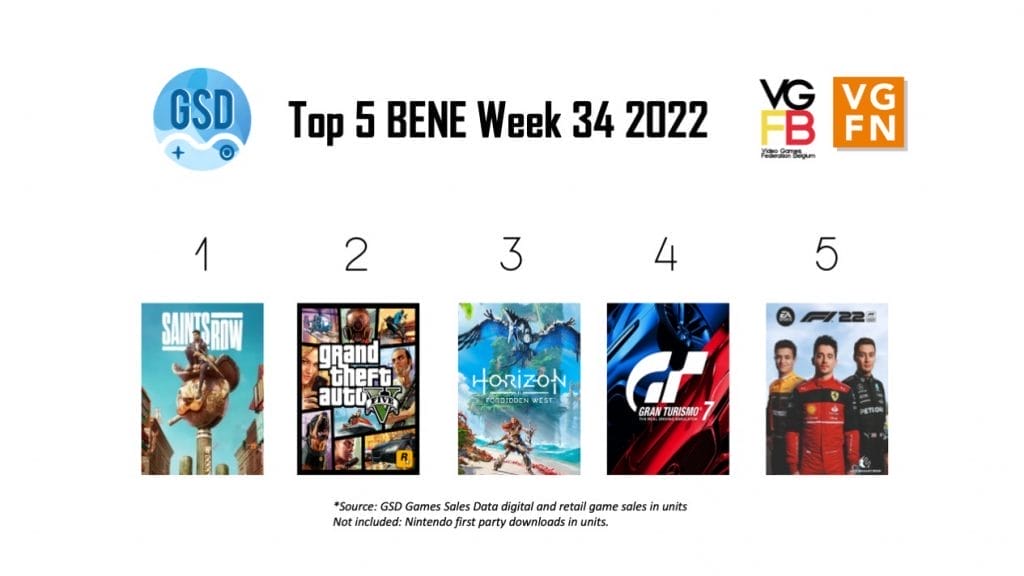 In week 34 van 2022 staat nieuwkomer Saints Row op de eerste plek. Op de tweede plek staat GTA V, een game die iedere week wel een plek heeft in de top 5. Op nummers 3 en 4 staan twee Sony-games namelijk Horizon II: Forbidden West en Gran Turismo 7. Als laatste op nummer 5 staat de racegame F1 22.