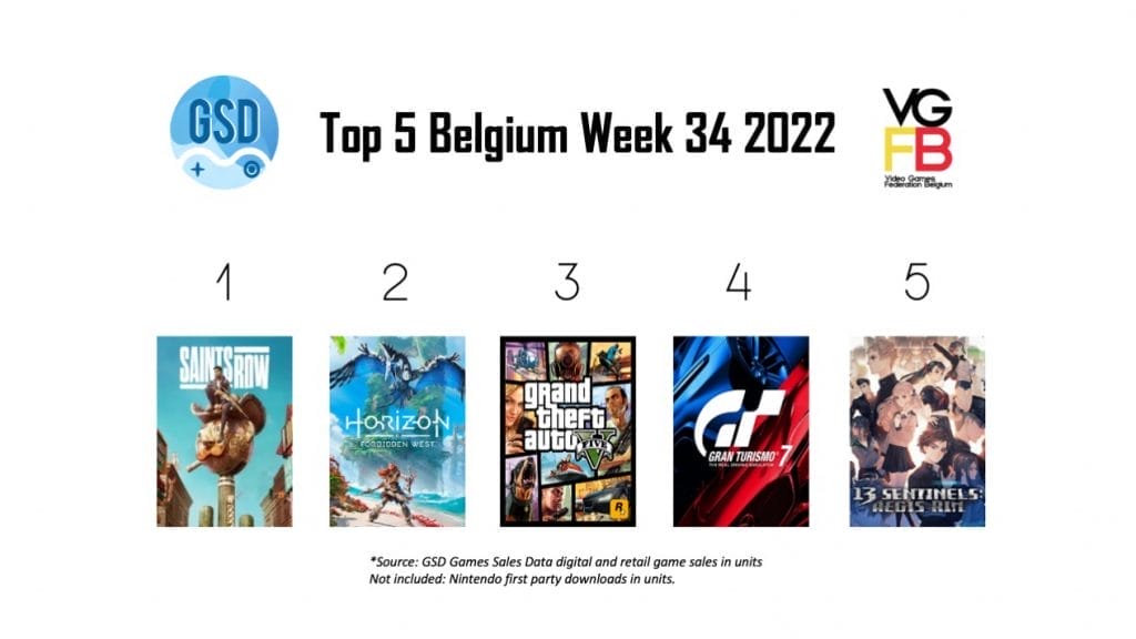 De top 5 van alleen België is ietsje anders. Op nummer 1 staat ook hier de reboot van Saints Row. GTA V en Horizon II: Forbidden West zijn hier van plek gewisseld. Op nummer 4 staat Gran Turismo 7 en op op 5 staat de JRPG 13 Sentinels: Aegis Rim.