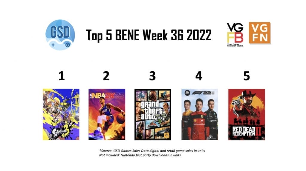 In week 36 van 2022 staat nieuwkomer Splatoon 3 op de eerste plek. Op nummer 2 staat ook een nieuwe release namelijk NBA 2K23. Op de derde plek staat GTA V, een game die iedere week wel een plek heeft in de top 5. Op nummers 3 en 4 staan F1 22 en Red Dead Redemption 2.