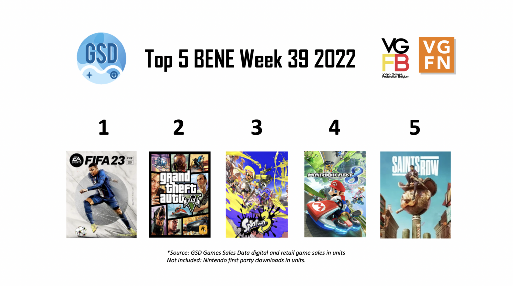 In week 39 van 2022 staat nieuwkomer FIFA 23 op de eerste plek, wat geen verrassing is want FIFA 22 was één van de best verkopende games van afgelopen jaar. GTA V staat op de tweede plek, een game die bijna 10 jaar oud wordt. Mogelijk hebben de leaks van GTA 6 gezorgd voor extra hype. Op nummer 3 staat nieuwkomer Splatoon 3 met daarna nog een Nintendo Switch-game namelijk Mario Kart 8 Deluxe. Op nummer 5 best verkopende game van de Benelux staat de reboot van Saints Row.
