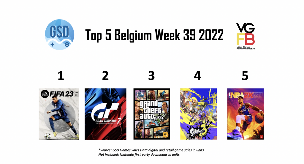 De top 5 van alleen België is ietsje anders. Gran Turismo 7 staat hier op de tweede plek achter FIFA 23. GTA V staat op plek nummer 3, gevolgd door Splatoon 3 en NBA 2K23.