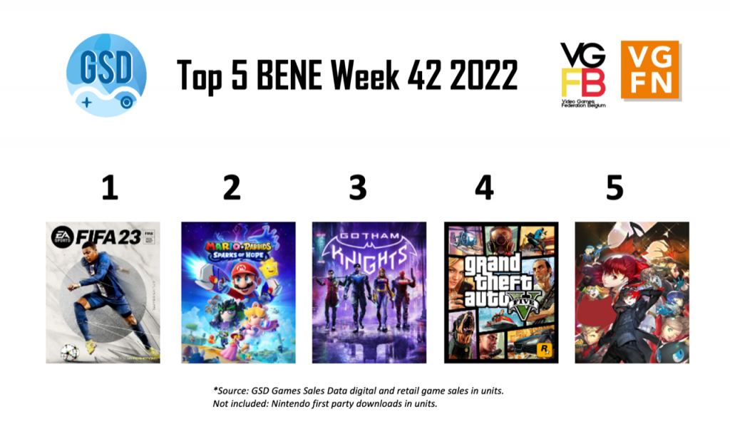 In week 42 van 2022 staat wederom FIFA 23 op de eerste plek. Op nummer 2 staat de nieuwe exclusieve Nintendo Switch-game Mario + Rabbids Sparks of Hope. Op nummer 3 staat de open wereld superhelden game Gotham Knights, gevolgd door GTA V en de multiplatform release van de geprezen JRPG Persona 5 Royal.