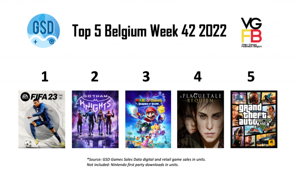 De top 5 van alleen België is ietsje anders. Gotham Knights en Mario + Rabbids Sparks of Hope zijn hier van plek gewisseld. Op nummer vier staat de verhaalgedreven game A Plague Tale: Requiem, en als laatste op nummer 5 staat GTA V.