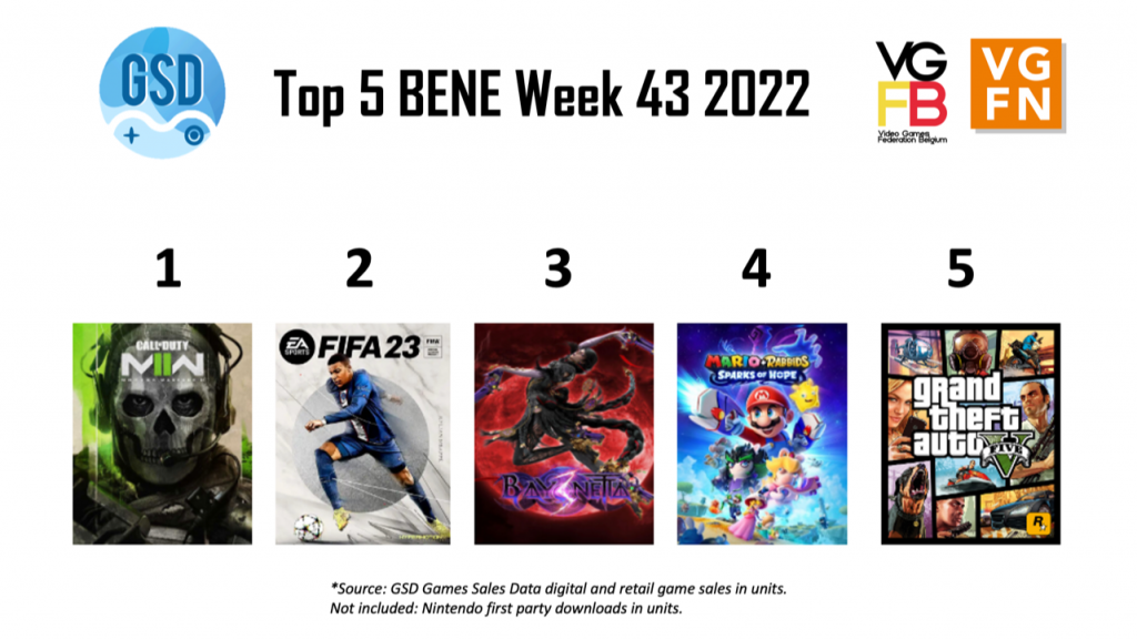 In week 43 van 2022 staan er vooral nieuwe games in de top 5 met op de eerste plek Call of Duty: Modern Warfare 2. Op de tweede plaats staat FIFA 23 die naar verwachting heel lang een plek zal behouden in de top 5 lijsten. Op nummer 3 en 4 staan wederom nieuwe titels namelijk de Nintendo Switch-exclusieve games Bayonetta 3 en Mario + Rabbids Sparks of Hope. Als laatste op nummer 5 staat GTA V, een game die het al bijna 9 jaar goed doet wat betreft verkoopcijfers.