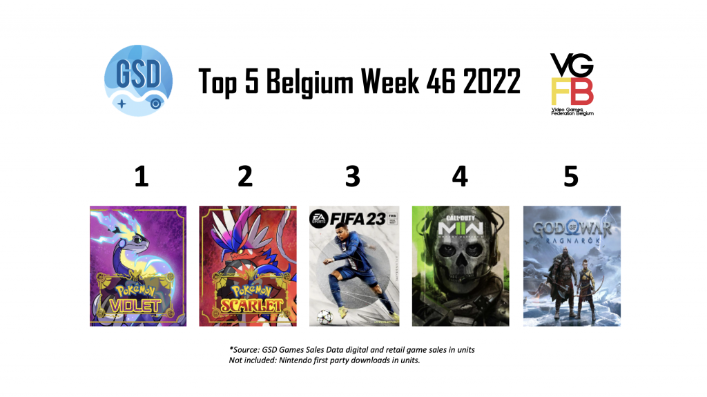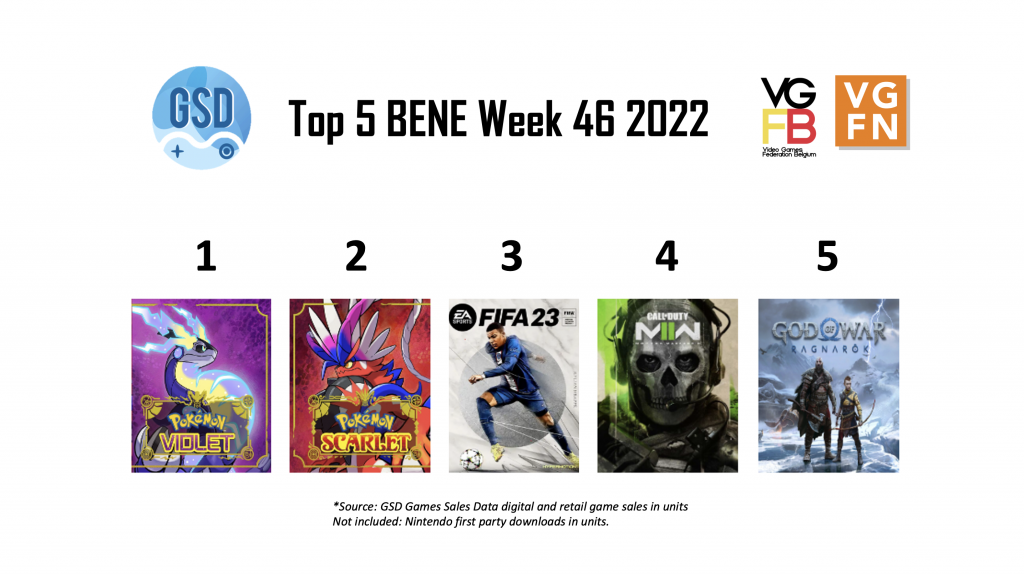 In week 46 van 2022 staan er vooral nieuwe games in de top 5 met op de eerste twee plekken Pokémon Violet en Pokémon Scarlet. Deze games zijn in de eerste 3 dagen van release, wereldwijd 10 miljoen keer verkocht, wat werkelijk insane is.