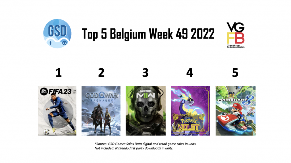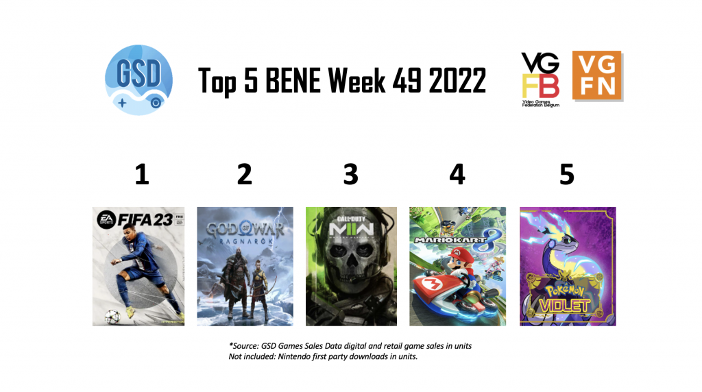 In week 49 van 2022 staat FIFA 23 op de eerste plaats, geen verrassing aangezien het WK nog gespeeld wordt en deze content gratis in de game te vinden is. Op nummer 2 staat de PlayStation-exclusieve God of War: Ragnarok. Dan op nummer 3 Call of Duty: Modern Warfare 2, een game die aanzienlijk goed verkoopt. Call of Duty wordt gevolgd door Mario Kart 8: Deluxe en Pokémon Violet.