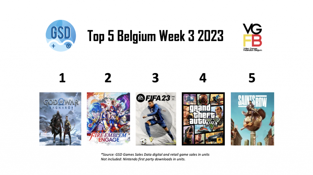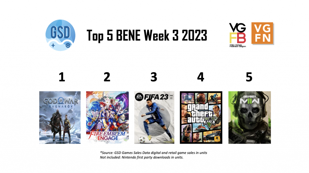 In week 3 van 2023 staat de PlayStation-exclusieve God of War: Ragnarok op de eerste plek, een game die veel game van het jaar 2022 prijzen heeft gewonnen. Op nummer 2 deze week staat nieuwkomer Fire Emblem Engage, een exclusieve tactische RPG voor de Nintendo Switch. Dan op nummer 3 staat een game die altijd wel in de top 5 staat namelijk FIFA 23. Deze game wordt gevolgd door GTA V en Call of Duty: Modern Warfare 2.