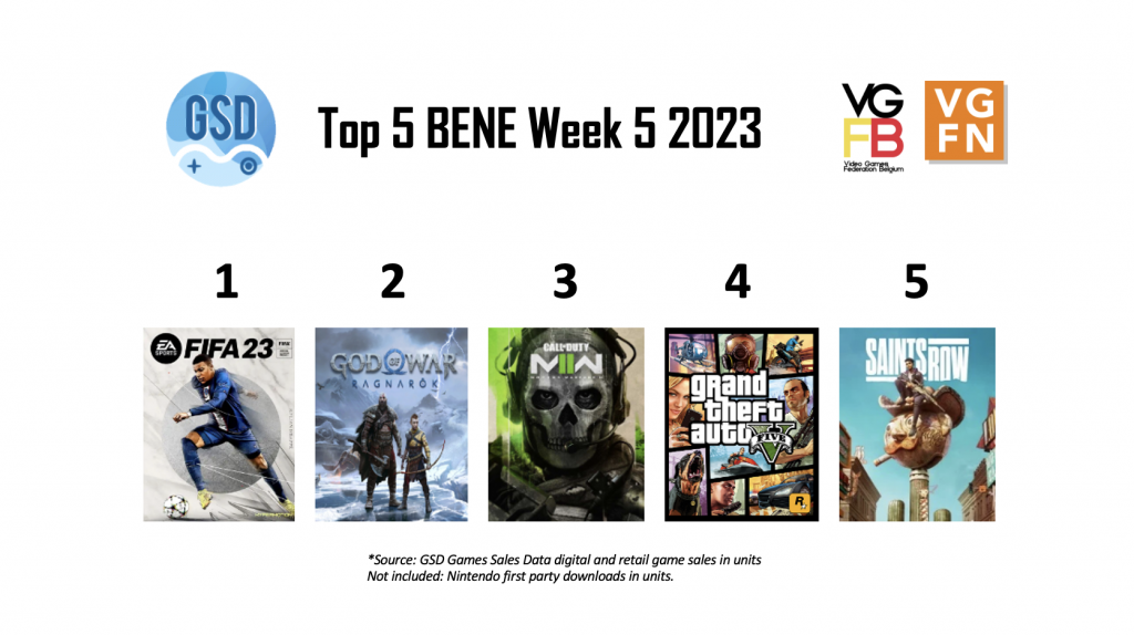 In week 5 van 2023 staat FIFA 23 op de eerste plek, een game die altijd wel goed verkoopt tot de volgende voetbalgame in de winkels verschijnt. Op nummer 2 staat de PlayStation-exclusieve God of War: Ragnarok. Op nummer staat de succesvolle shooter Call of Duty: Modern Warfare 2, gevolgd door de open wereld games GTA V en Saints Row.