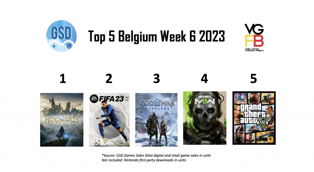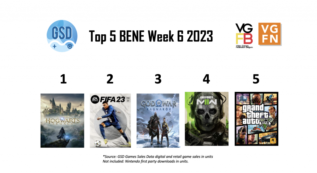 In week 6 van 2023 staat een nieuwkomer op de eerste plek namelijk de open wereld Harry Potter spin-off game Hogwarts Legacy. Op nummer 2 staat FIFA 23, een game die vrijwel iedere week in de top 5 staat. FIFA 23 wordt gevolgd door PlayStation-exclusieve God of War: Ragnarok, de populaire shooter Call of Duty: Modern Warfare 2 en de best verkopende premium game ooit gemaakt GTA V.