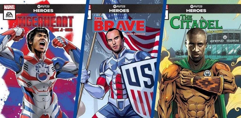 Enkele iconische voetballers zijn door Marvel getekend als een superheld en zijn voorzien van een superheldennaam. Denk aan iconische voetballers zoals Yaya Toure, Ricardo Carvalho, Diego Forlan, Dirk Kuyt en Harry Kewell. Deze voetballers zijn in FIFA 23 ook als standaard-kaarten te krijgen, maar de Hero-versies zijn voorzien van hogere ratings, zoals hieronder weergegeven.