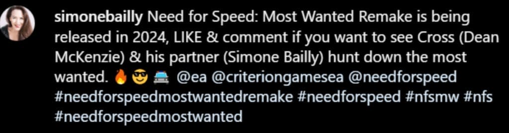 Het gerucht komt van Simone Bailly, een stem actrice die een rol had bij de originele Most Wanted game. Bailly zegt in een tweet die snel werd verwijderd dat er in 2024 een remake komt van Need for Speed: Most Wanted. Als ontwikkelaar heeft Bailly, Criterion Games getaged.