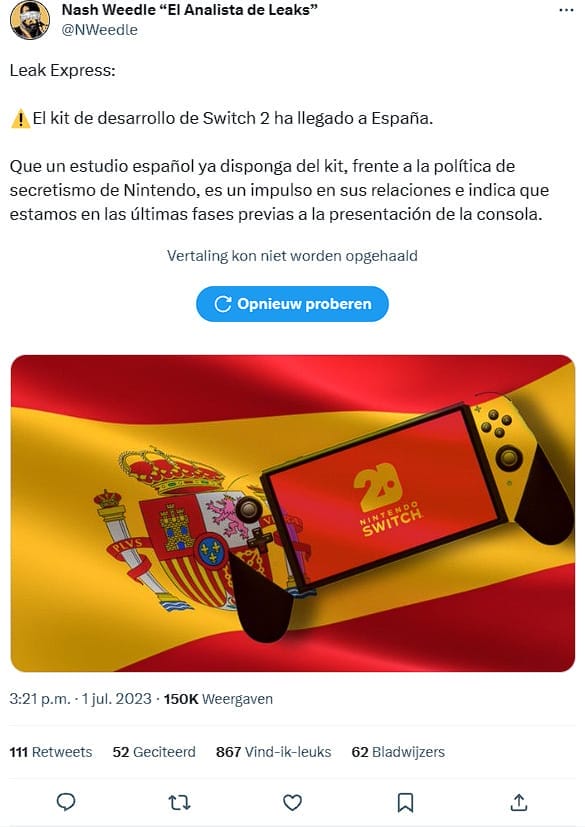 Volgens Youtuber genaamd Nash Weedle heeft een bekende Spaanse studio, een dev kit van de nieuwe console van Nintendo gekregen. Welke studio dit precies is, zegt Nash Weedle niet. Mogelijk gaat het om MercurySteam bekend van de games Metroid: Samus Returns en Metroid: Dread.