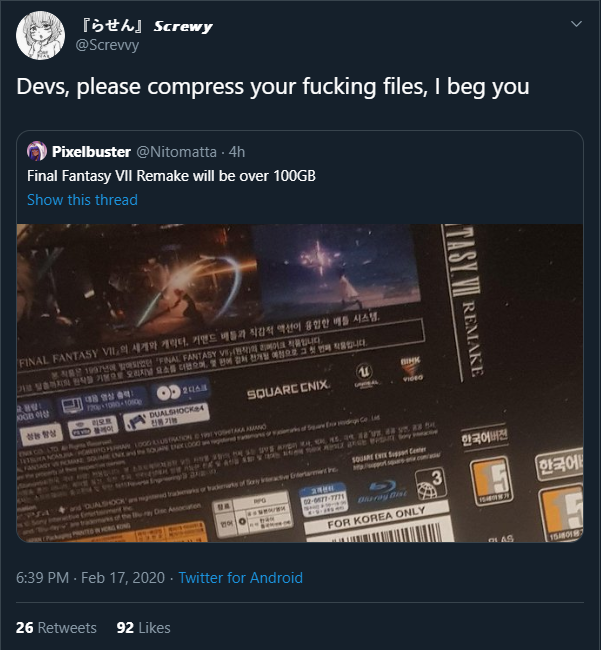 Nu we dichterbij de release zijn, worden ook alvast de game doosjes in massa’s geproduceerd zodat de game keurig op de releasedag in de winkels te vinden is. Op de achterkant van de Japanse cover is te lezen dat Final Fantasy VII Remake 100GB groot is en dat is zonder een eventuele day one update.