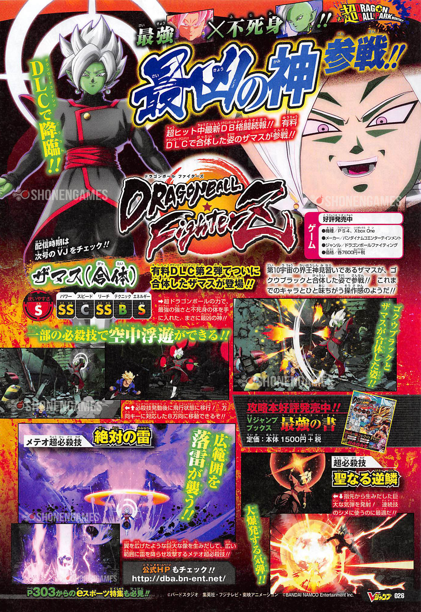 Binnenkort kunnen fans aan de slag met Fused Zamazu. Twee populaire personages uit Dragon Ball Super namelijk Zamasu en Goku Black fuseren met de Potara Fusion en worden zo Fused of Merged Zamasu genoemd. In de scans van de van de V-Jump-Magazine kunnen we de eerste screenshots zien van Fused Zamasu maar omdat alle tekst in het Japans is, moeten we wachten op de eerste vertalingen om meer te weten over zijn vaardigheden en speciale krachten.