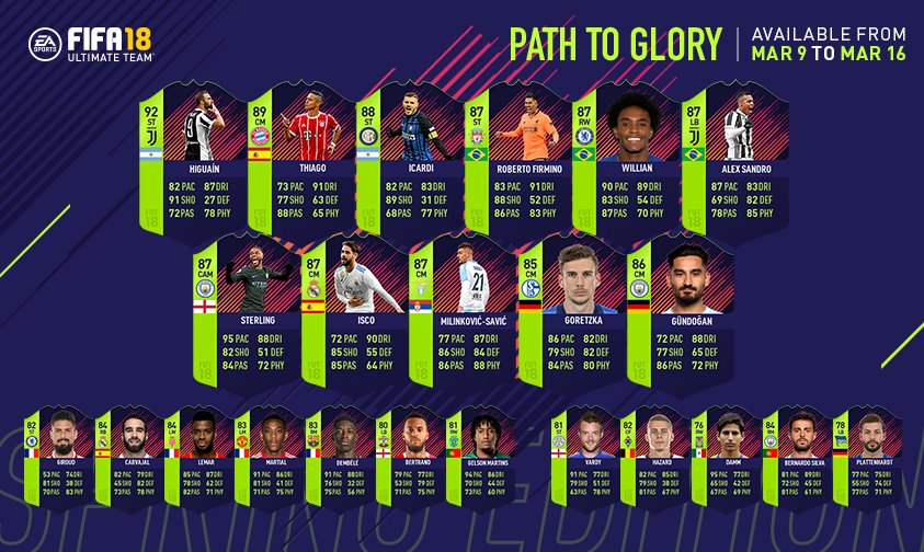 De Path to Glory spelers zijn spelers die vechten voor een plekje bij het nationale elftal waarin zij actief zijn. Het speciale aan een Path to Glory speler is dat zij een dynamische rating hebben. Dit betekend dat, wanneer de speler in het TOTW zit, de Man of the Match is, een Hero is of een Record breaker is, de kaart automatisch verbeterd wordt.