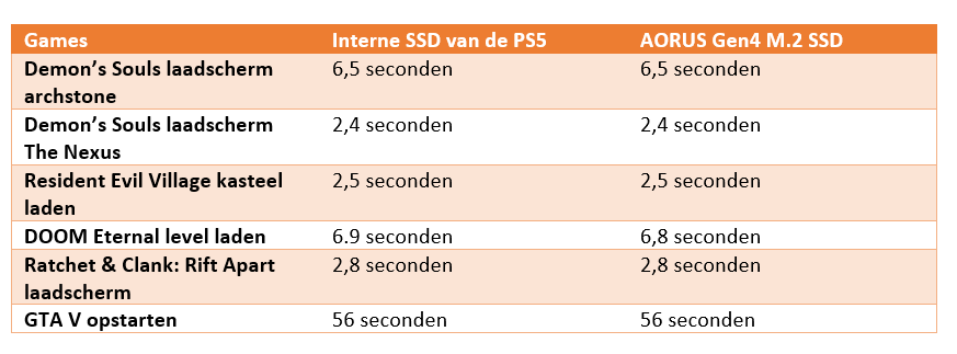 Ook laden van games is waanzinnig snel. Wij hebben de games Demon’s Souls, GTA V, Resident Evil Village en Ratchet & Clank: Rift Apart, eerst getest op de interne SSD van de PlayStation 5 zelf. Daarna hebben we deze games overgezet op de AORUS Gen4 7000s SSD en alle tests opnieuw gedaan. De resultaten zijn hieronder weergegeven.