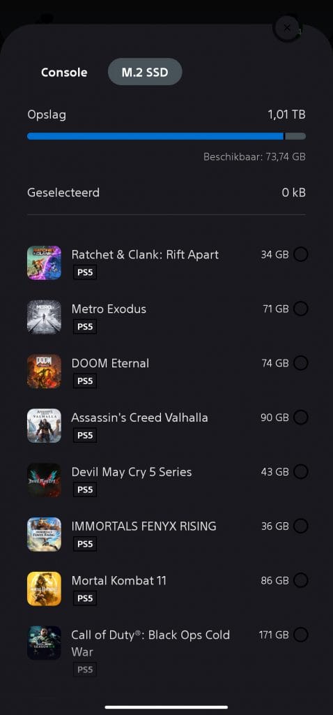 Na deze instelling te hebben aangevinkt, hebben wij een heleboel games geïnstalleerd op de AORUS Gen4 M.2 SSD. Omdat we de volle 1TB tot onze beschikking hadden, hebben we wel 17 PS5-games geïnstalleerd, inclusief de gigantische PS5-versie van Call of Duty Black Ops: Cold War. Installatie op de SSD ging net zo snel als op de interne harde schijf. Het uitpakken van games (op de PS5 kopiëren genoemd) gaat heel snel.