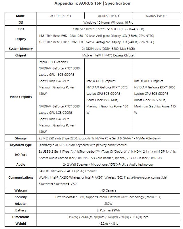 De AORUS 15P bevat verder DDR4 3200 RAM-geheugen, Thunderbolt 4 en PCIe Gen 4.0 SSD. Vergeleken met de vorige generatie is door middel van PCIe Gen 4.0, sprake van een verdubbeling in bandbreedte capaciteit. Daarnaast is er een HDMI 2.1-aasnluting waardoor je op een tv of monitor kan gamen op 4K op een framerate van 60 FPS.