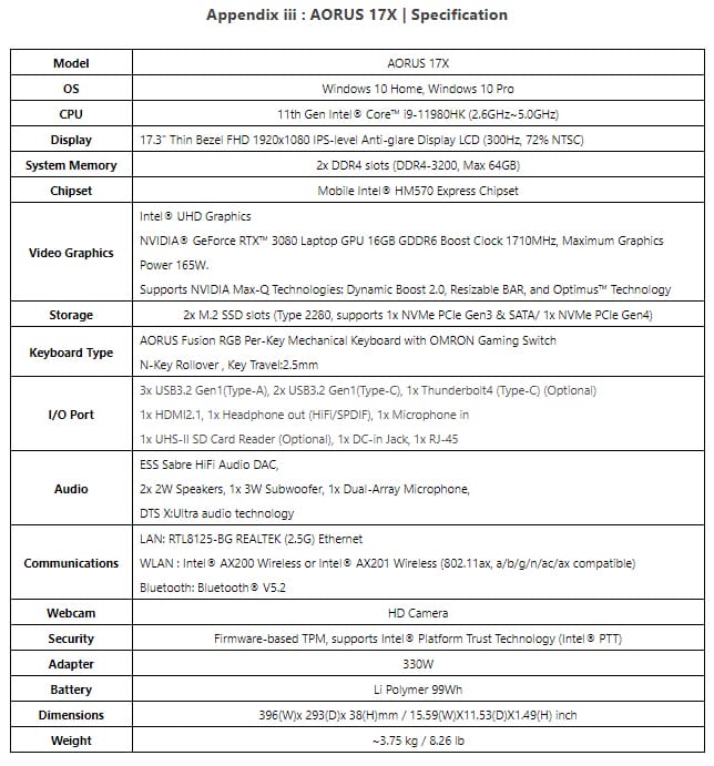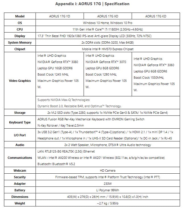 Net als de AORUS G15 is de AORUS G17 uitgerust met de Intel Core i7-11800H with 8 cores and 16 threads met een TGP van maar liefst 45W. Wat betreft GPU kunnen kopers kiezen tussen een RTX 3060 tot een RTX 3080.